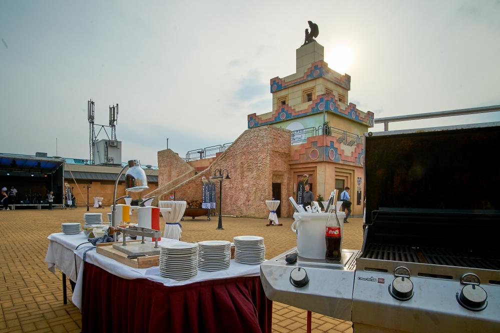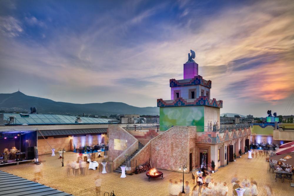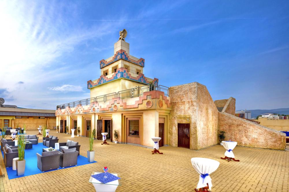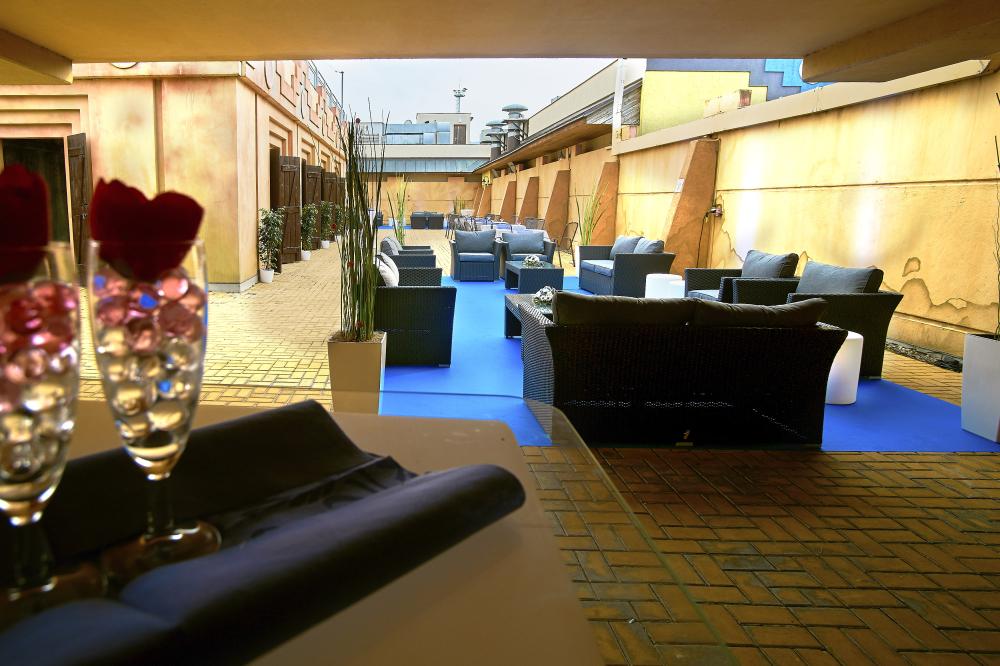 The terrace is a great place for a barbecue, an open-air concert or disco, or even a fire show. It includes a covered ziggurat for catering facilities. It can be connected to the Gold Club.